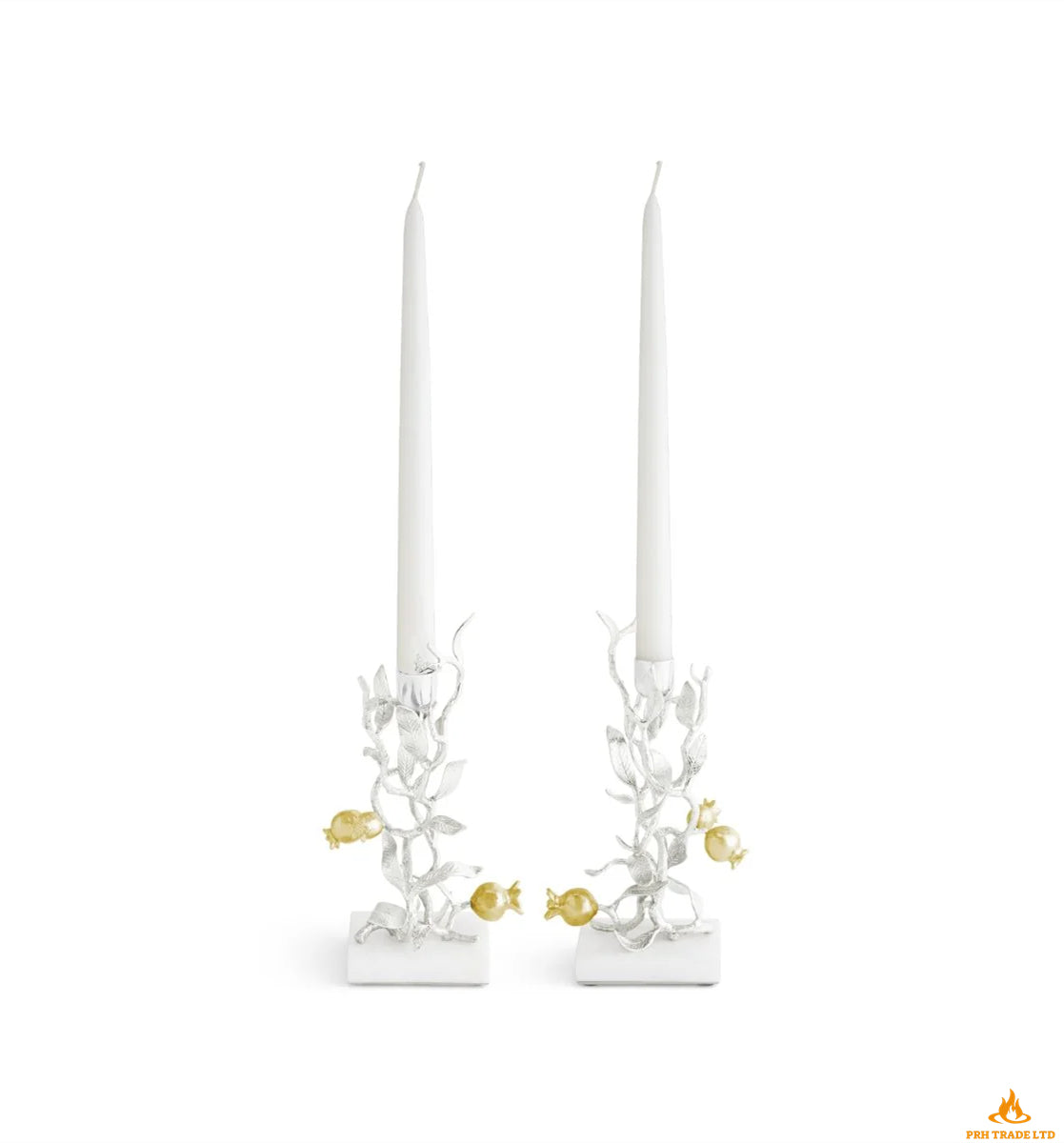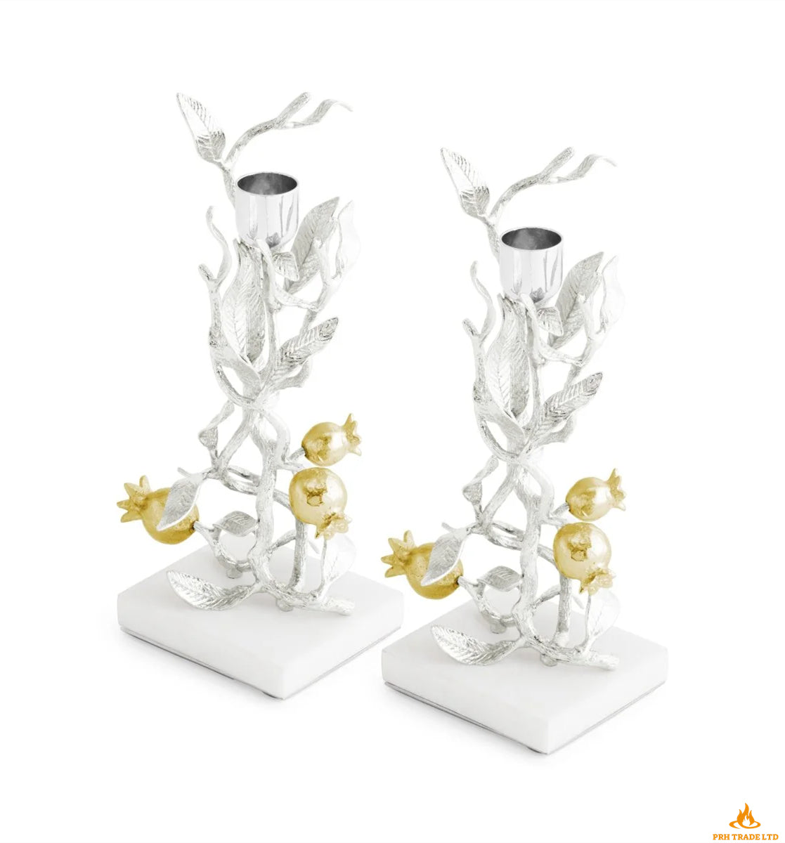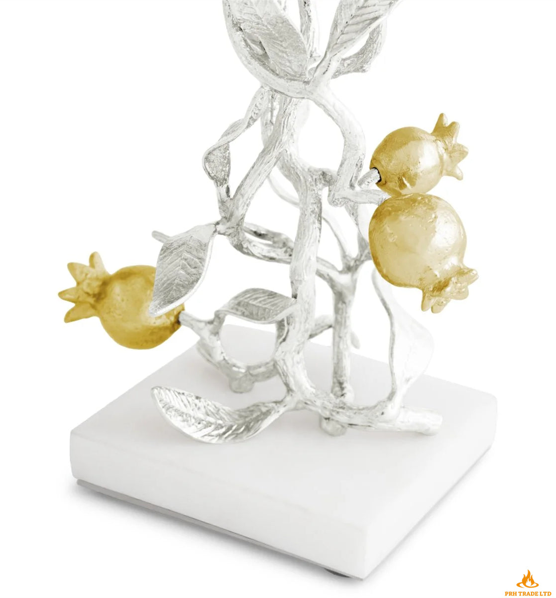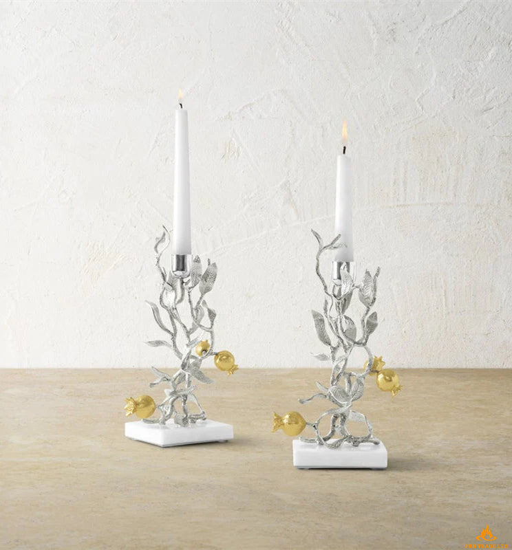 This set of Mal Pomegranate candlesticks, meticulously handcrafted with exquisite detail, adds warmth and elegance to any space. A harmonious blend of nickel plating, marble, and 24K gold accents, each piece embodies timeless craftsmanship and symbolic beauty.