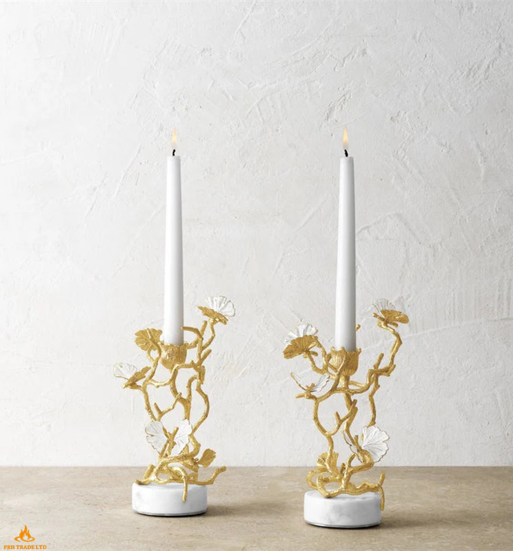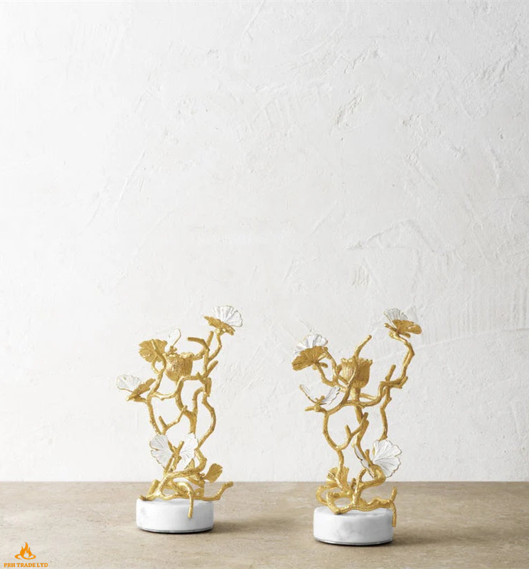 This pair of luxurious handcrafted candlesticks, featuring brass-carved ginkgo leaves and white enamel butterflies, creates a soaring, radiant image, adding a touch of elegance to your space. Each piece is meticulously handcrafted in shimmering gold and rests on an ornate marble base, creating a perfect balance of grace and strength.